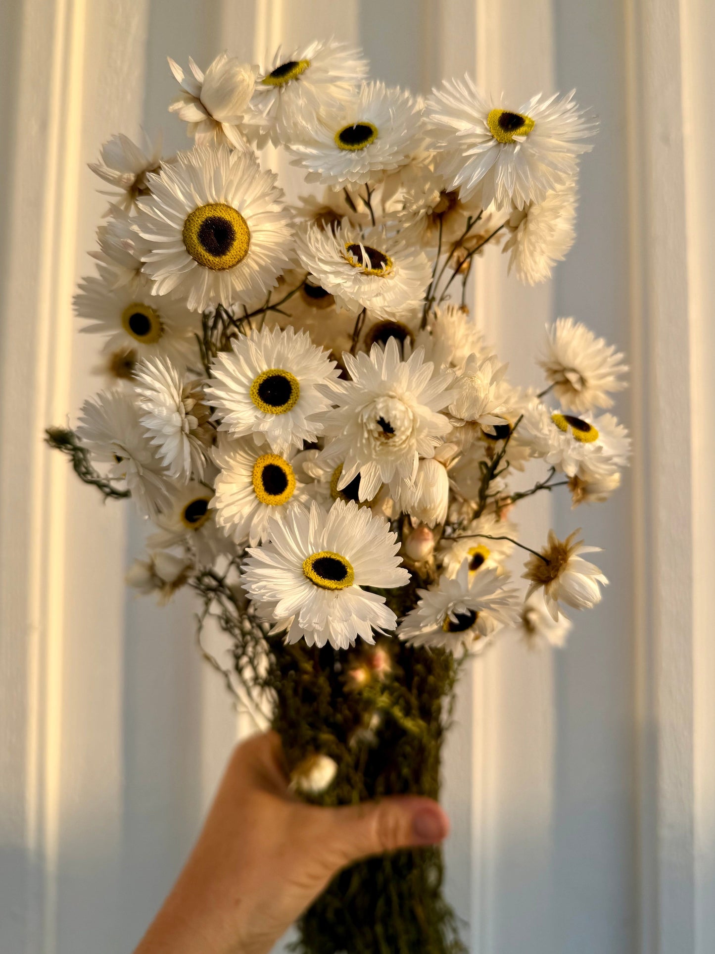 Den torkade buketten i pappersprästkrage fångar känslan av högsommar på ängen – vita, tydliga blommor i hållbar form. En långlivad inredningsdetalj som fungerar i allt från stilla vardagsinredning till mer genomarbetade festdekorationer, med minimal skötsel och maximal sommarkänsla.