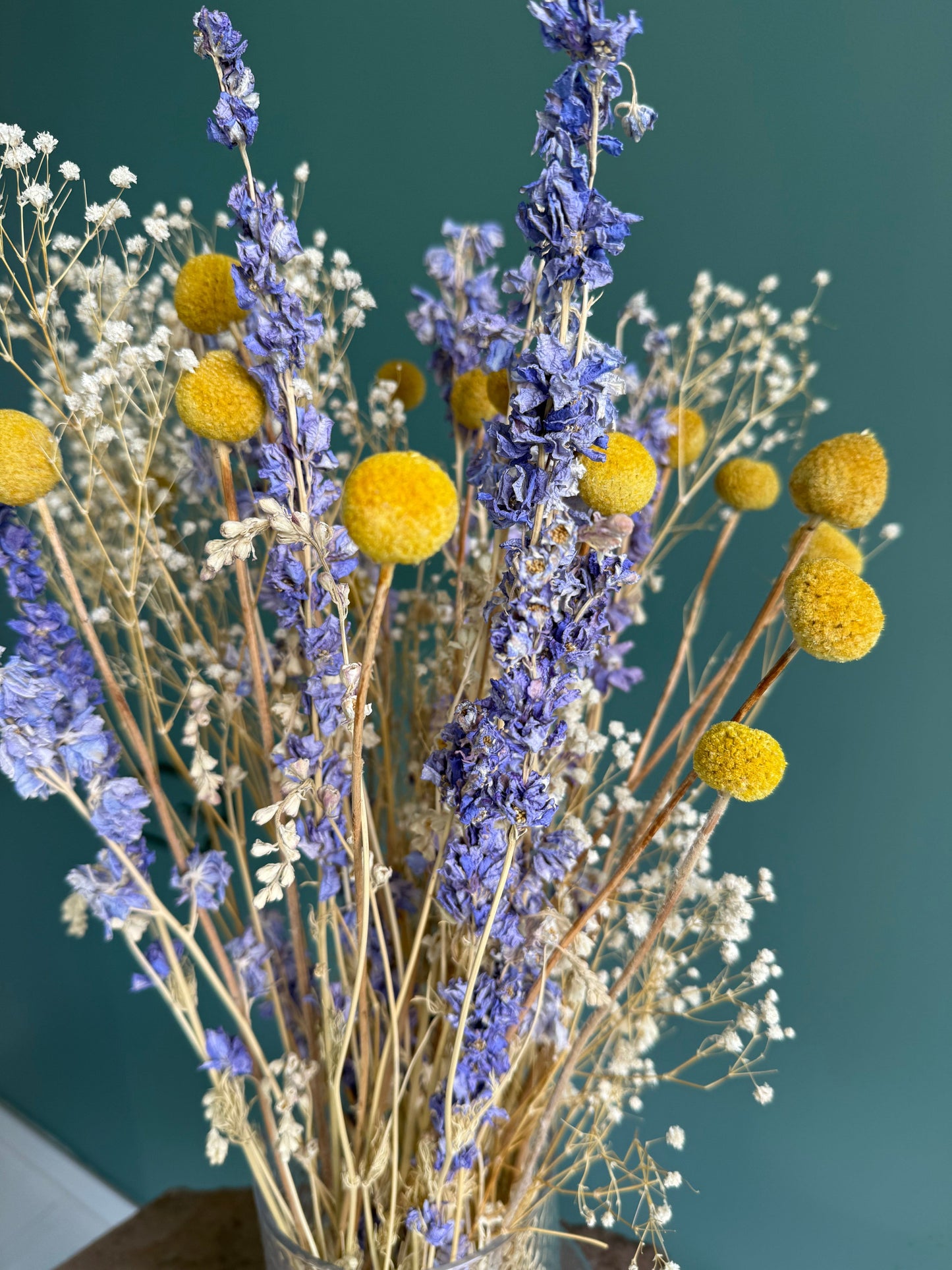 Torkad solboll (Craspedia) har en intensiv gul ton och sina karakteristiska runda blomhuvuden som skapar både rytm och höjd i inredningen. Formen är ren, lekfull och modern, vilket gör den särskilt uppskattad i skandinaviska hem där små detaljer får göra stor skillnad.