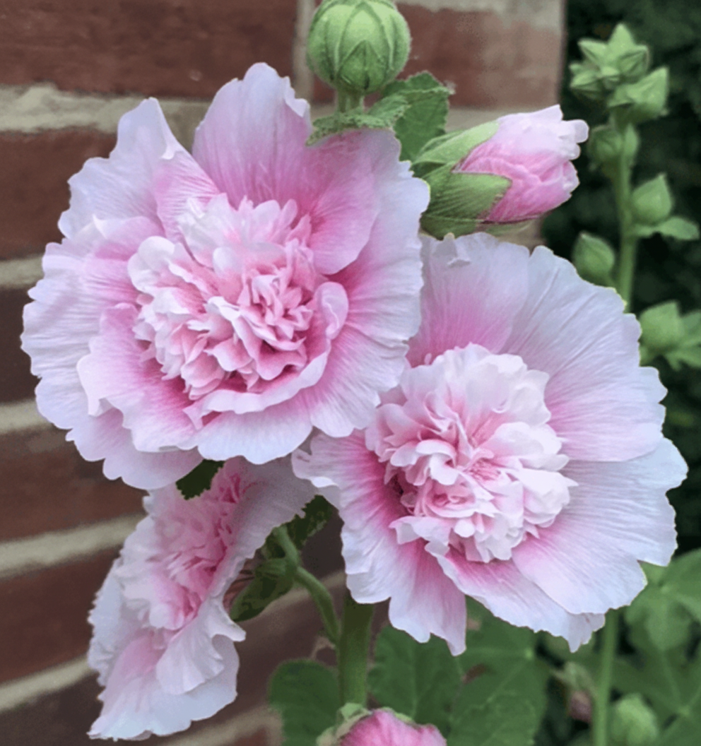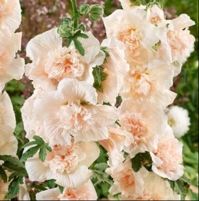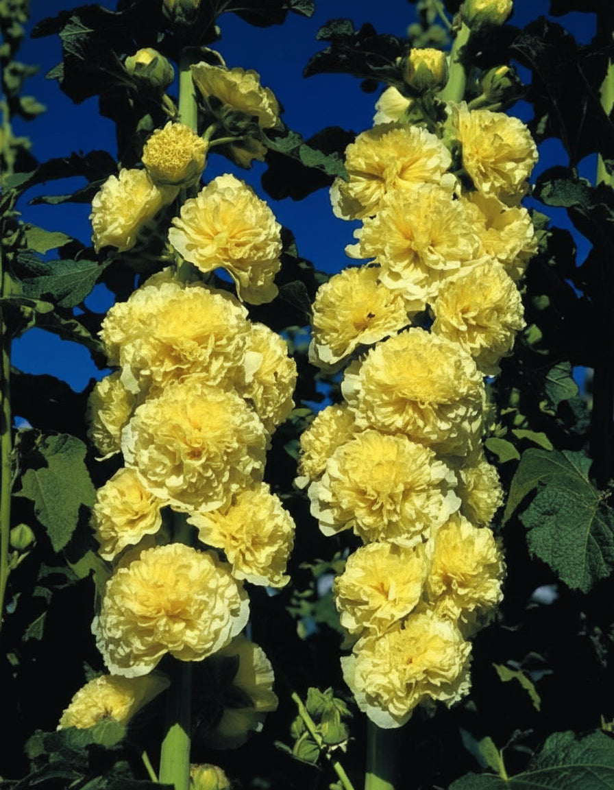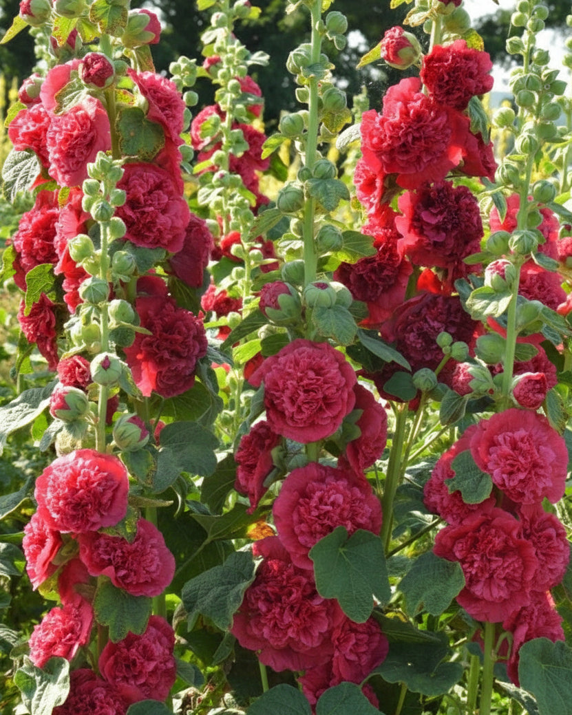 Stockrosor (Alcea rosea) skapar omedelbart känslan av romantisk sommarträdgård – höga spiror täckta av stora, sidenmjuka blommor i nyanser från pudrigt rosa och smörkräm till djup vinrött, aprikos och nästan svart. De trivs bäst i soligt läge intill vägg, staket eller husgrund, där de både får stöd och värme. Många sorter blommar redan första året vid förodling, annars från år två.
