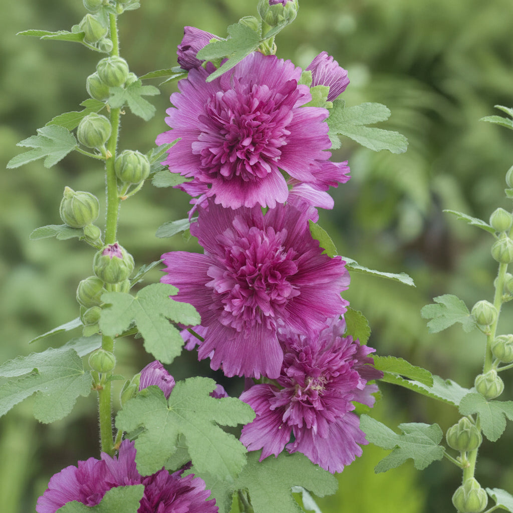 Stockros ‘Spring Celebrity Purple’ blommar i djup purpur med fyllig form och en stillsam tyngd i färgen. Spirorna sitter tätt och ger en tydlig linje som ramar in solvarma hörn, plank och fasader.
